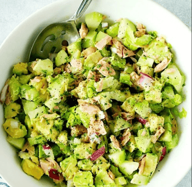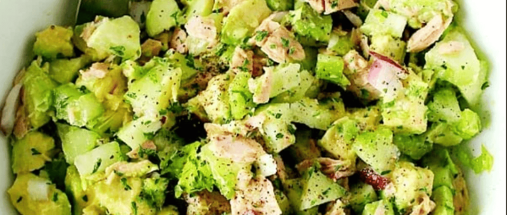 Combine ingredients: In a large mixing bowl, combine tuna, diced avocado, halved cherry tomatoes, thinly sliced red onion, and chopped cucumber.